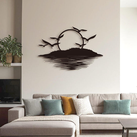 لوحة غروب الشمس مع المحيط و طيور النورس التجريدية