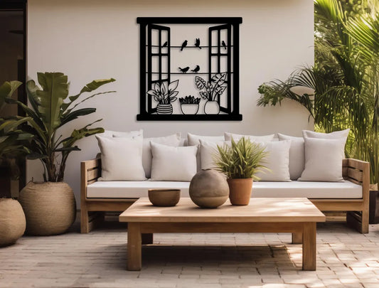 لوحة النافذة المفتوحة على الطيور مع النباتات